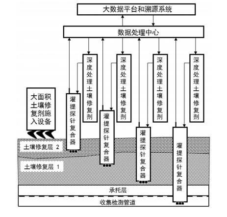 污染土壤的动态深度土壤修复设备及其修复方法,其特征在于:其中污染土壤的动态深度土壤修复设备包括设在待修复土壤表面上的大面积土壤修复剂施入设备和端头插置在待土壤土壤不同深度土层内的多个灌提探针复合器,所述灌提探针复合器内穿设有用于检测土壤用的探头、用于抽提取样的抽提取样管道和用于灌注深度处理土壤修复设备的灌注管道,所述探头通过数据线与设在灌提探针复合器上的数据采集分析收发器连接,所述灌注管道连通深度处理土壤修复剂。本发明该污染土壤的动态深度修复装置结构简单、设计合理,有利于实现土壤的修复、改良和检测。