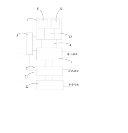 进一步地,微波加热解吸炉具有气体出口以及净土排口,净土排口与第一输送机 之间采用第二输送机进行连接。本实施例中,土壤中的有机污染物在微波加 热解吸炉内的解吸后进入气相中,其可由气体出口导入除尘净化装置内进行处理,而被 解吸后的土壤中半挥发或挥发性有机物含量非常低可视为净土,其由净土排口排出微波加 热解吸炉后运送至指定位置堆积。对于第二输送机通常选用绞龙式螺旋输送机,土壤在由 第一输送机4输送至微波加热解吸炉内的第二输送机上,通过螺旋翻滚土壤不但能够利于 土壤中半挥发或挥发性有机污染物的加热处理,还能够推动土壤至净土排口处。